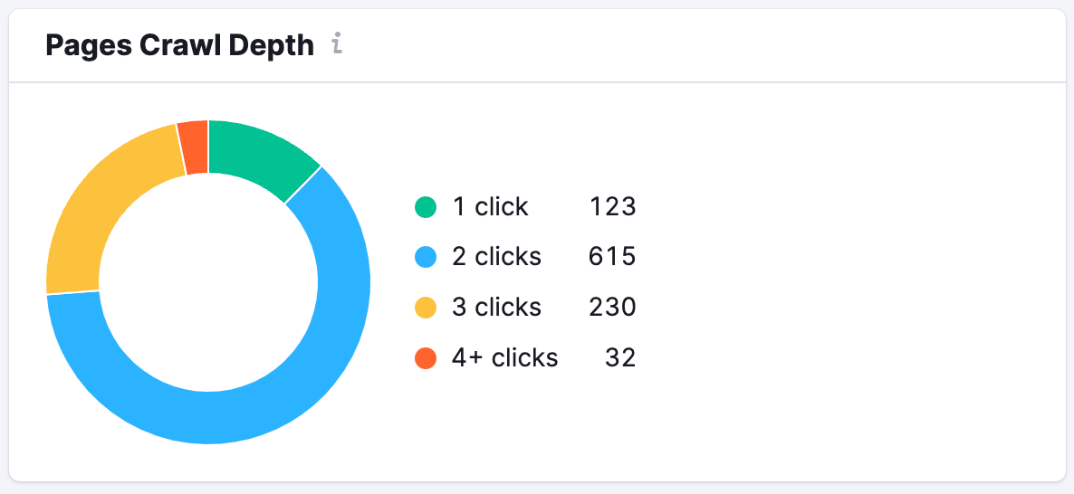 Then you will see a chart showing the Pages Crawl Depth. The number of clicks in the Pages Crawl Depth chart refers to how many clicks the crawler had to make on your site to reach each page during the crawl. With a lower crawl depth, it’s easier for a web crawler to find the content on your website. With a crawl depth of 4+, there is a possibility that a user or bot won’t even reach the page.